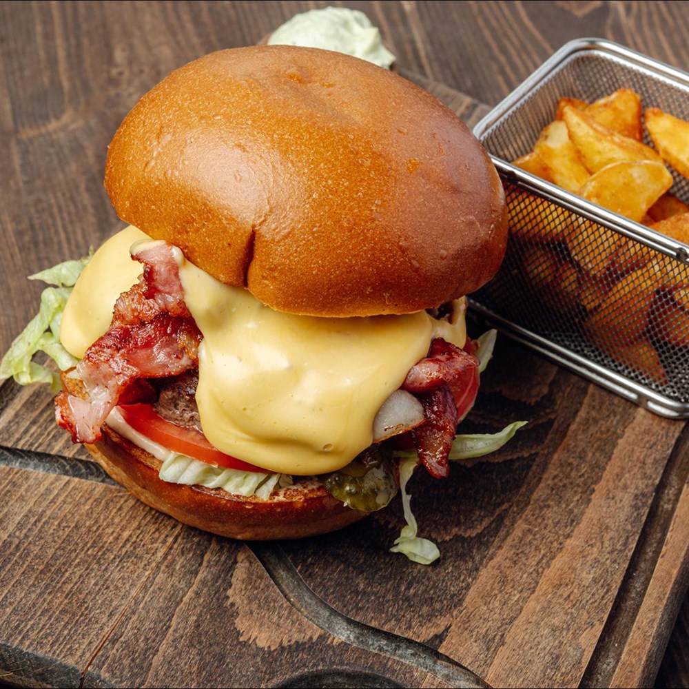 Говяжья котлета, репчатый лук, салат айсберг, помидор, маринованные огурцы, сыр чеддер, бекон, майонез, булочка бриошь, картофельные дольки, соус айоли, яйцо